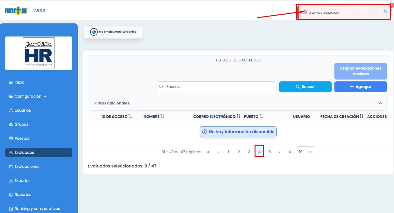 cerradaPantalla de evaluados, al llegar a la pagina 4 o mas de 30 registros no muestra informacion (Exclusivo de IdEmpresa JHR53686)