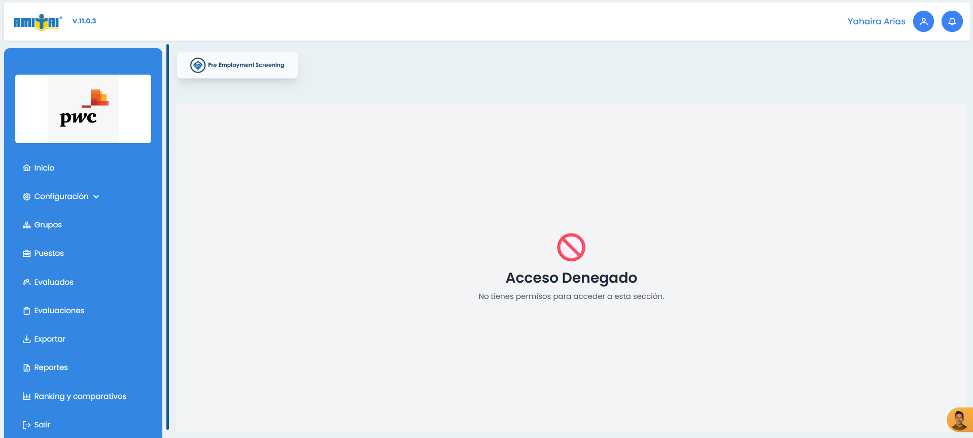 La empresa PWC (Perú) no indica que en el menú de "Puestos" les arrojo el mensaje de "Acceso denegado" y no le permite ver información. Agrego la imagen
