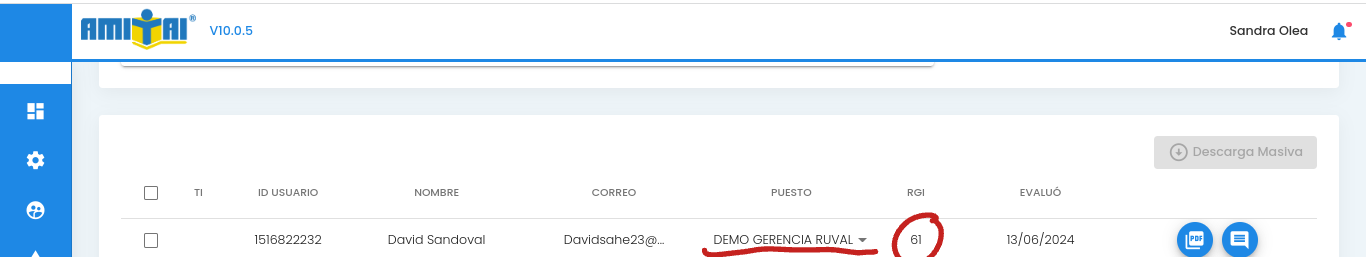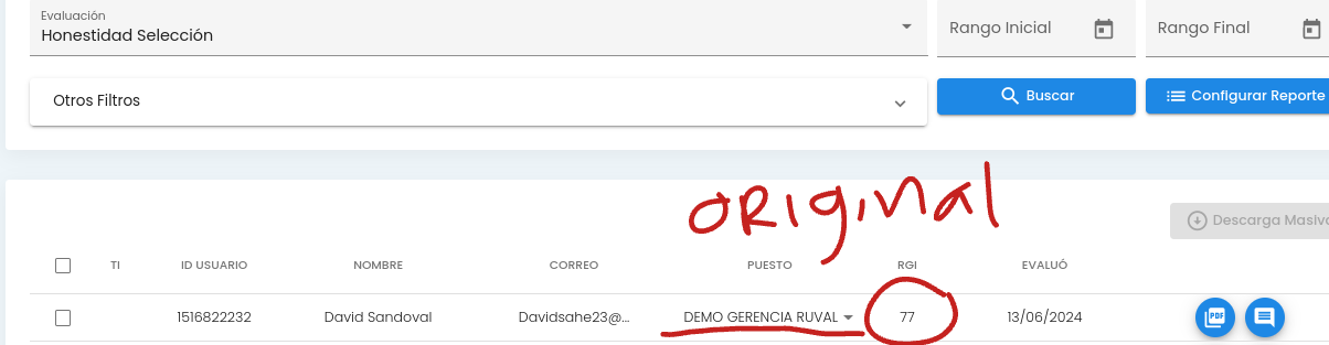 Adjunto capturas del ejemplo en mi usuario de la cuenta PRU4417. El id de evaluado es 1516822232, el puesto en el que se evaluó es Demo Gerencial Ruval y este obtuvo un puntaje de 77, al momento de compararlo con el puesto de "contador" el puntaje cambia a 61, el 61 se queda con el puesto "demo gerencial" y el reporte si se descarga sigue con ese resultado e indicando puesto contador.