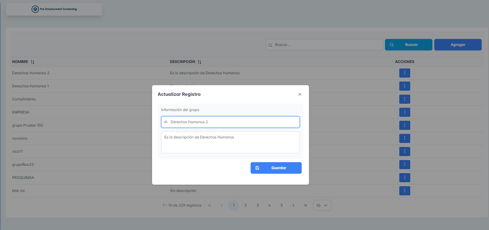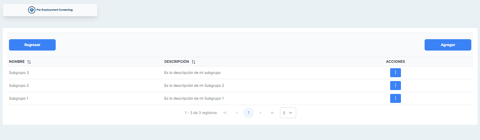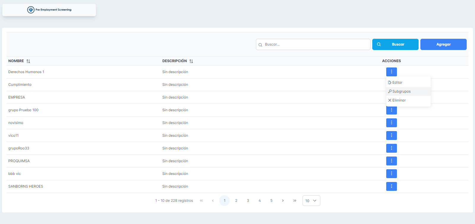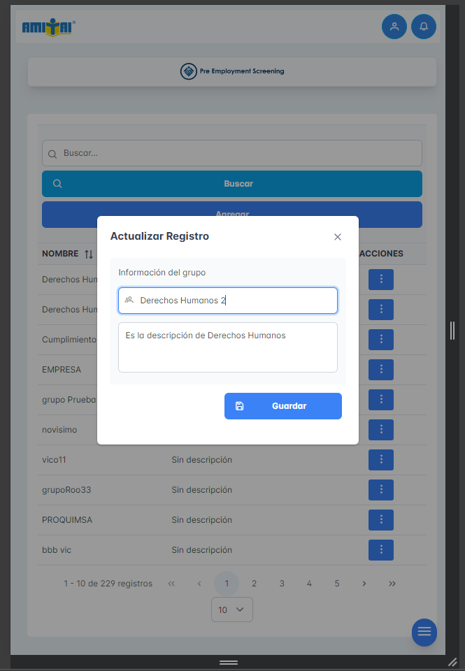 Se adjunta capturas de las pantallas del módulo de grupo y subgrupos