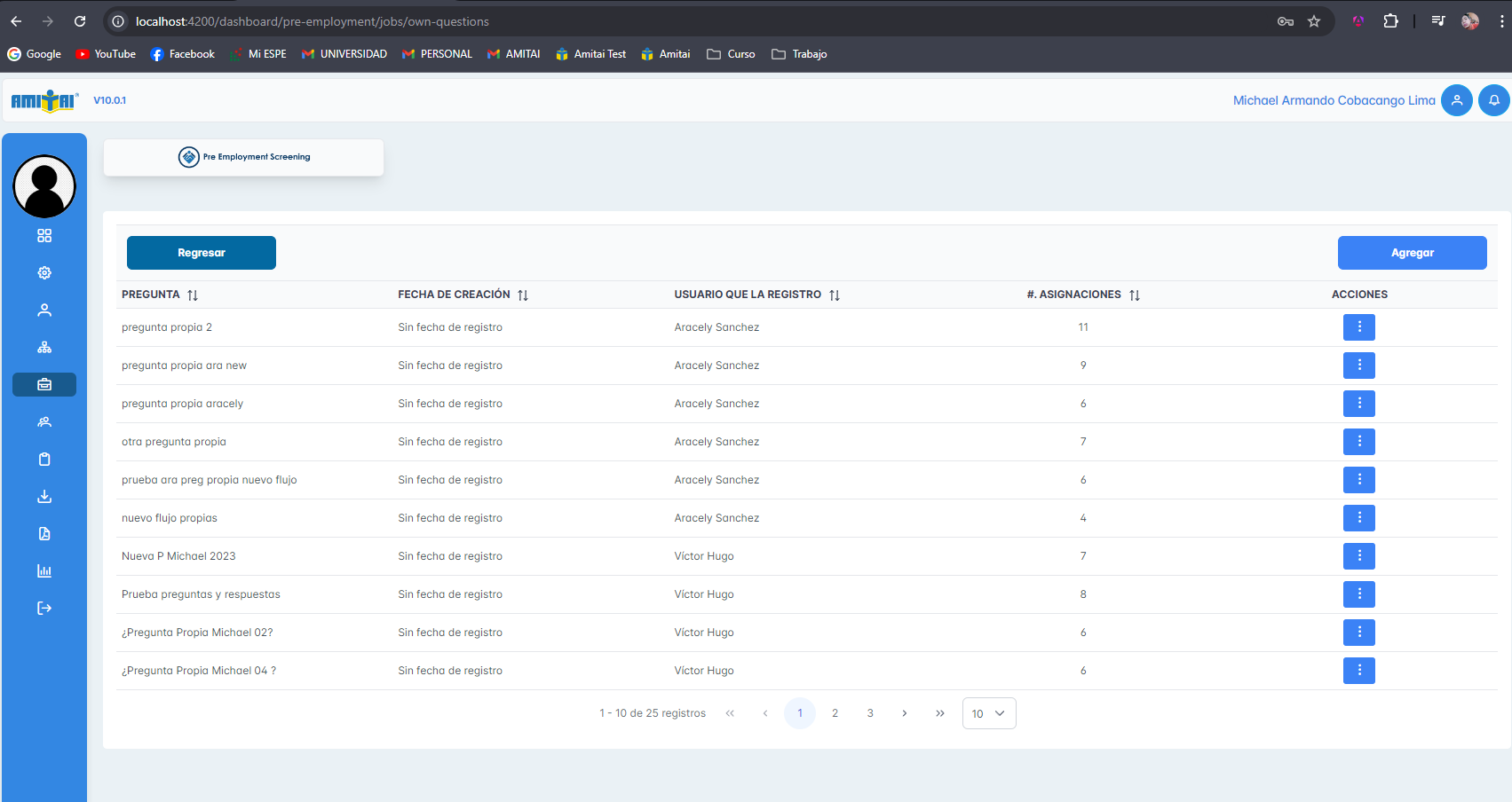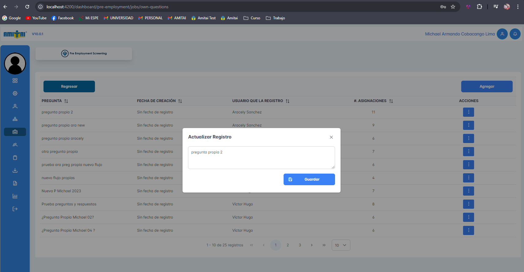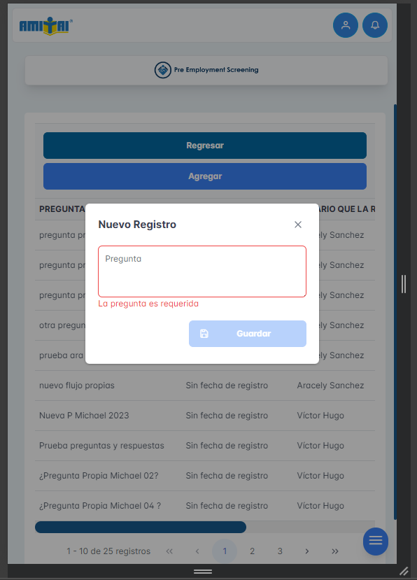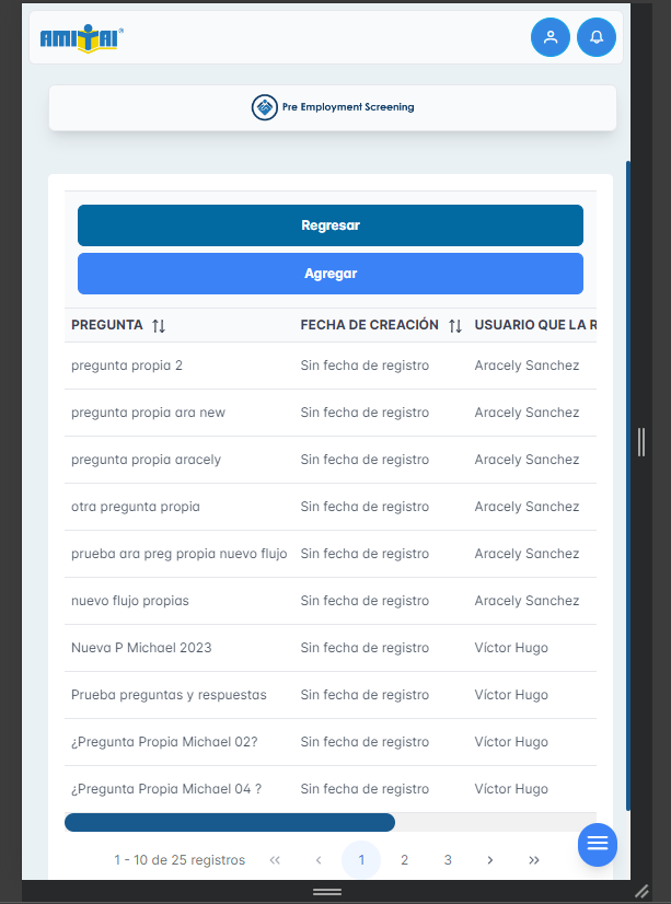 Se adjuntan capturas del módulo de preguntas propias, agregar, editar y eliminar preguntas propias, además, de visualizar las respuestas de cada pregunta