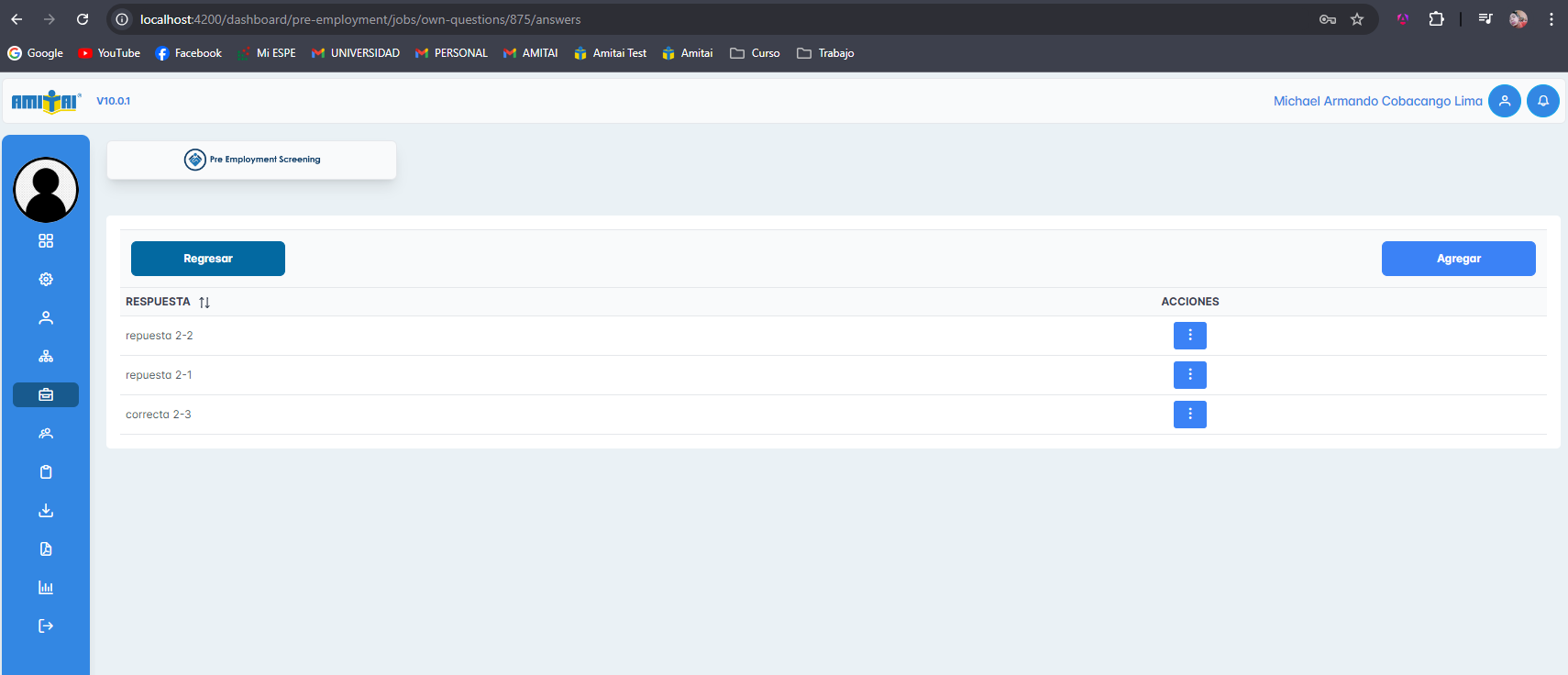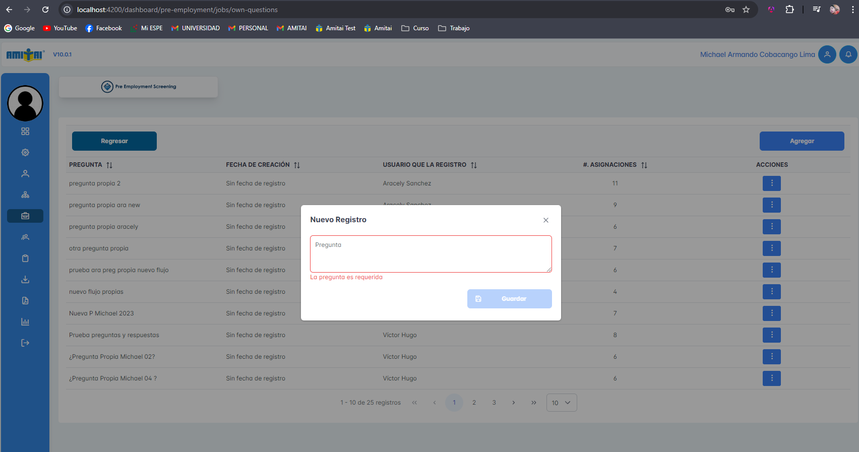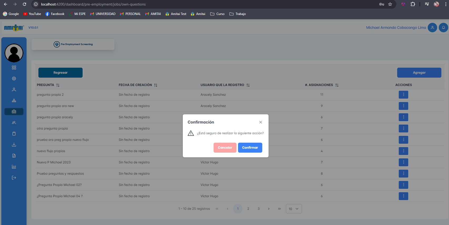 Se adjuntan capturas del módulo de preguntas propias, agregar, editar y eliminar preguntas propias, además, de visualizar las respuestas de cada pregunta