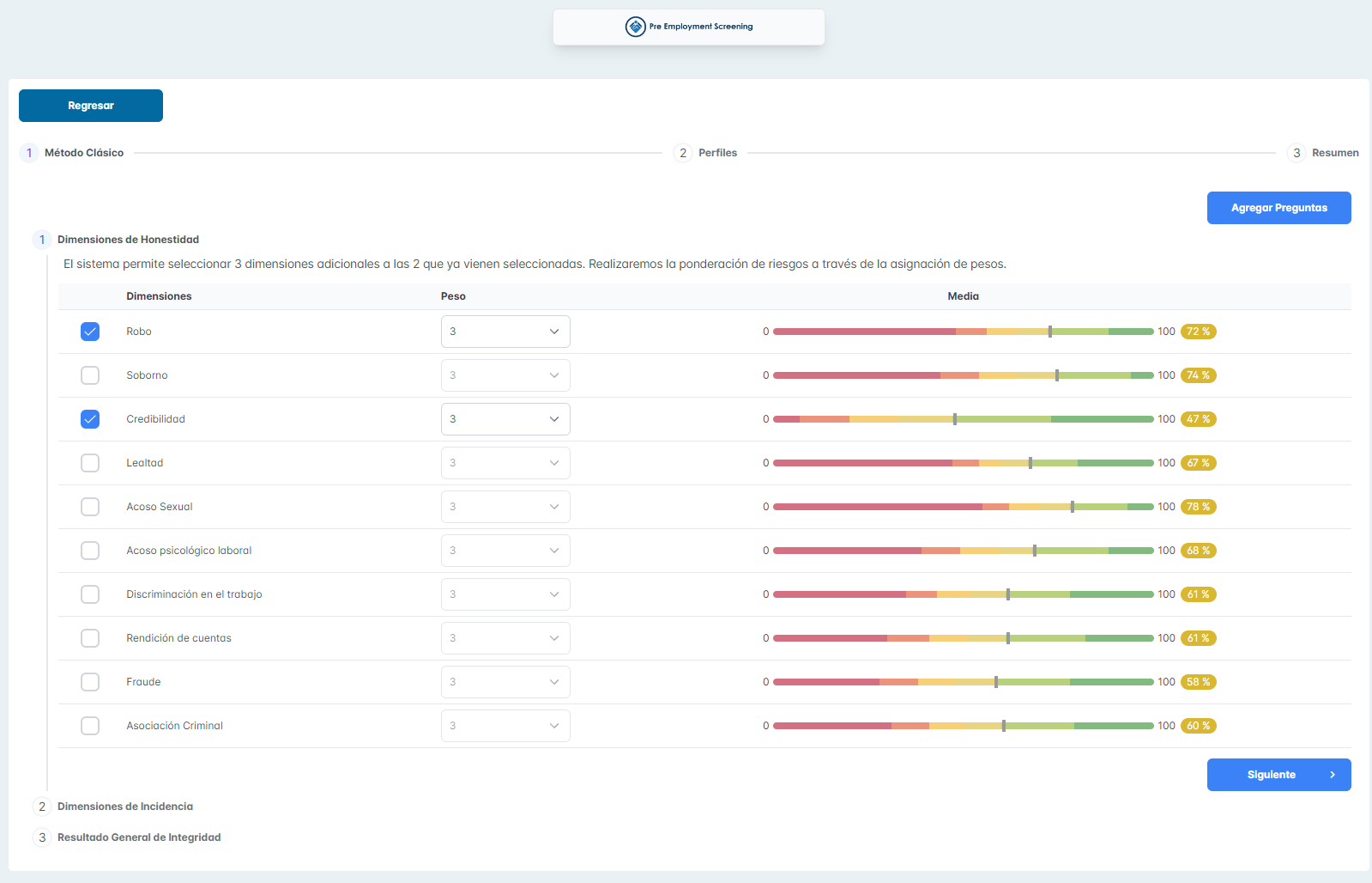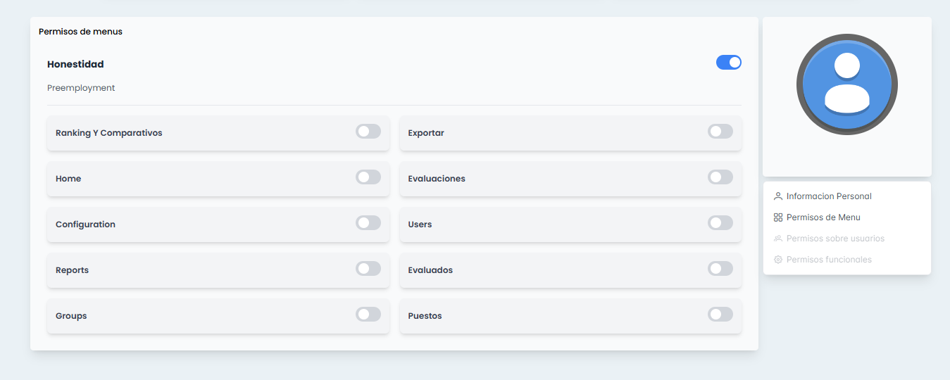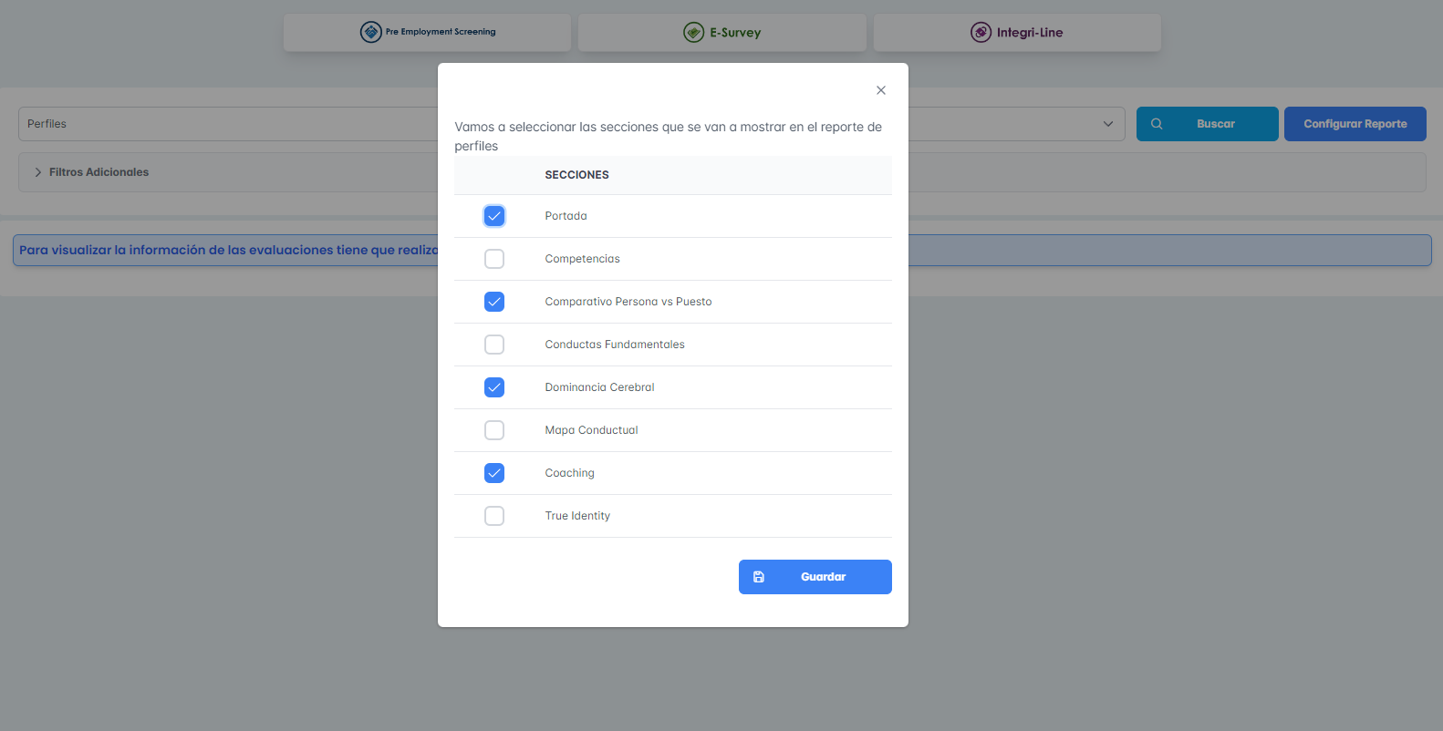 Se adjuntan capturas de la configuración de secciones del reporte de honestidad selección y de perfiles