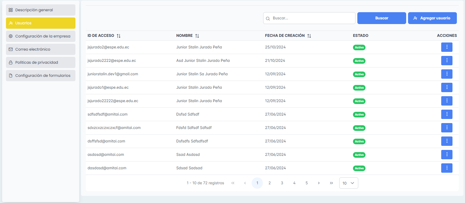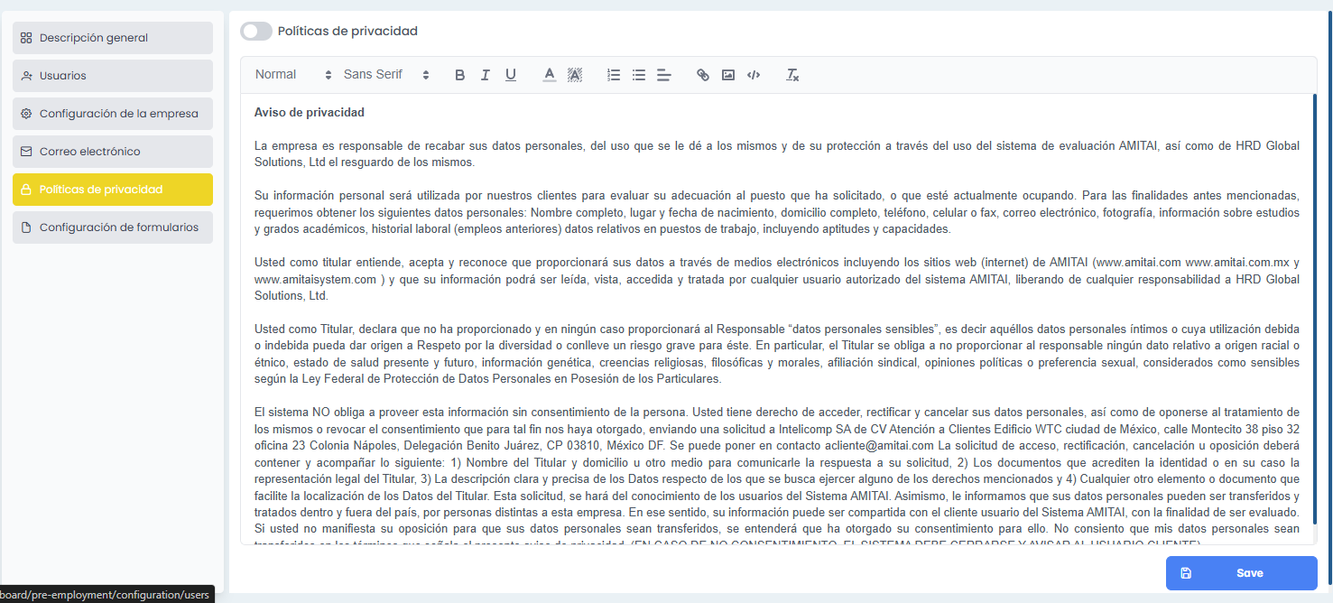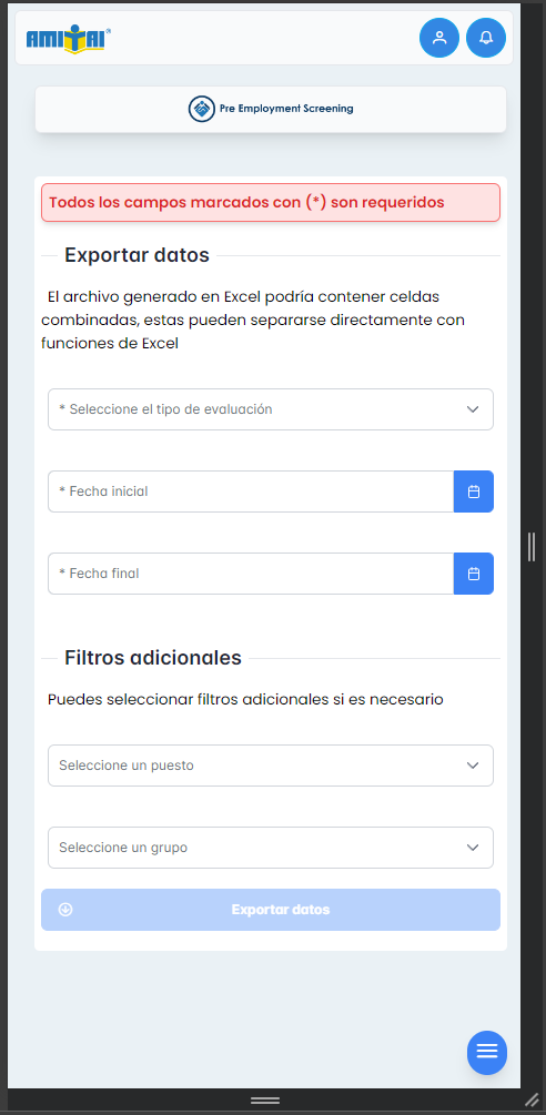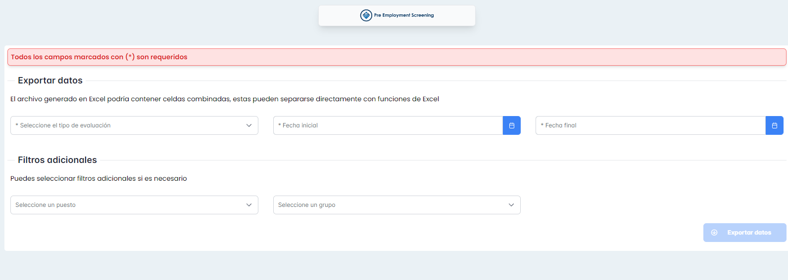 Se adjunta imágenes del módulo de exportar datos en pre employment