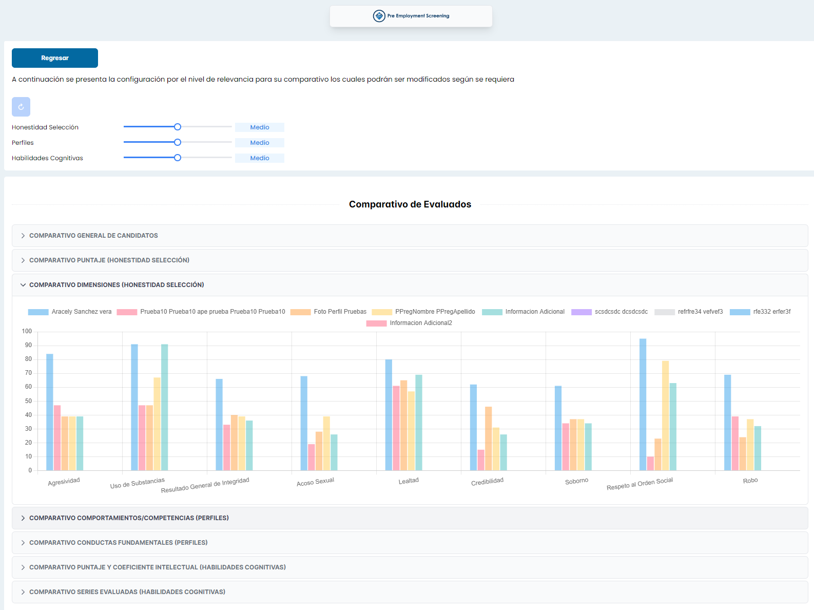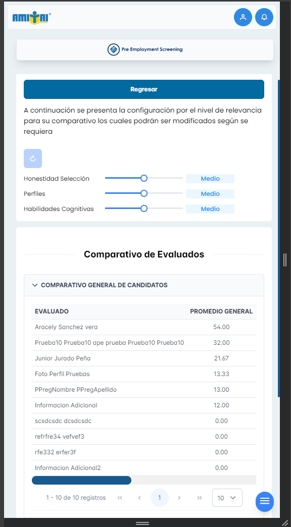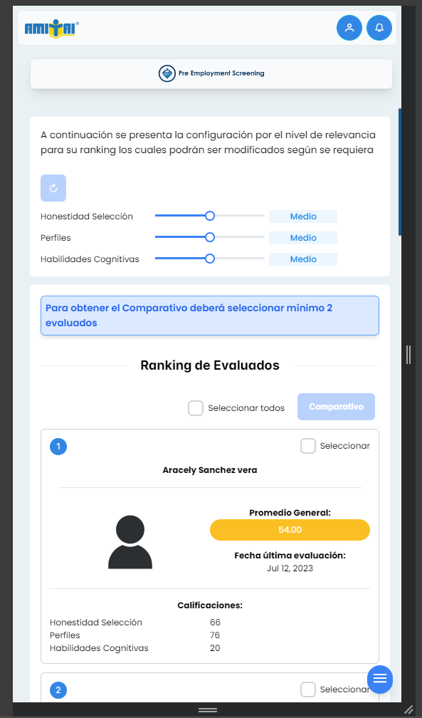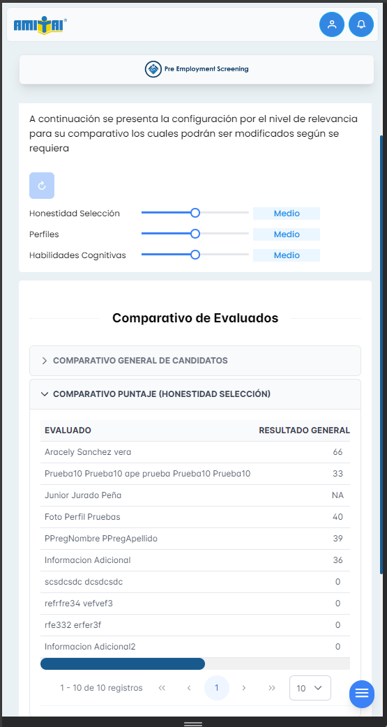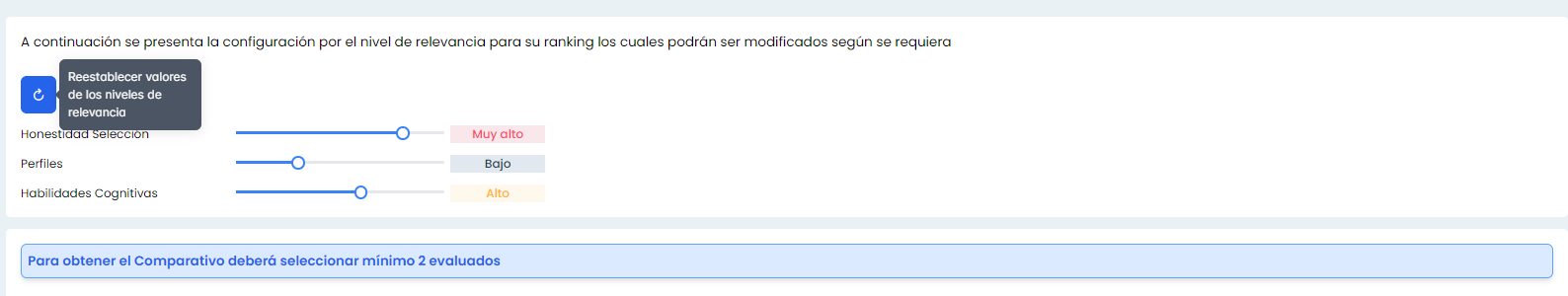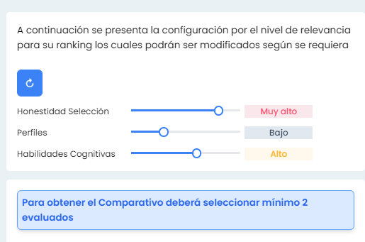 Se adjuntan capturas de las secciones de Comparativo General de Candidatos, y comparativo puntaje Honestidad Selección, también se desarrolla nueva funcionalidad de reestablecer los valores del nivel de relevancia, paginación de las tablas de información, y se agrega un botón de regresar al menú de Ranking y poder seleccionar nuevamente los evaluados que desea comparar