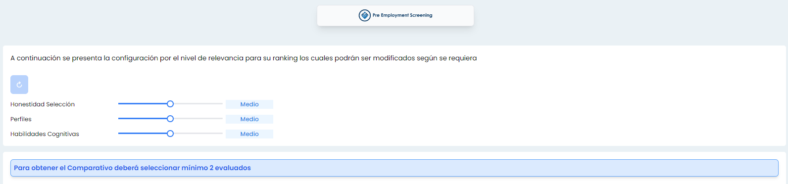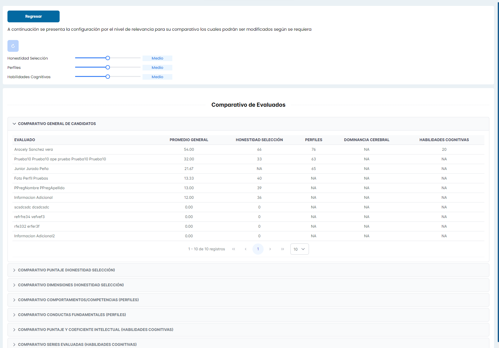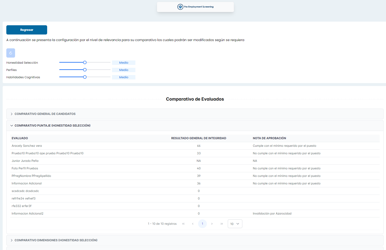 Se adjuntan capturas de las secciones de Comparativo General de Candidatos, y comparativo puntaje Honestidad Selección, también se desarrolla nueva funcionalidad de reestablecer los valores del nivel de relevancia, paginación de las tablas de información, y se agrega un botón de regresar al menú de Ranking y poder seleccionar nuevamente los evaluados que desea comparar