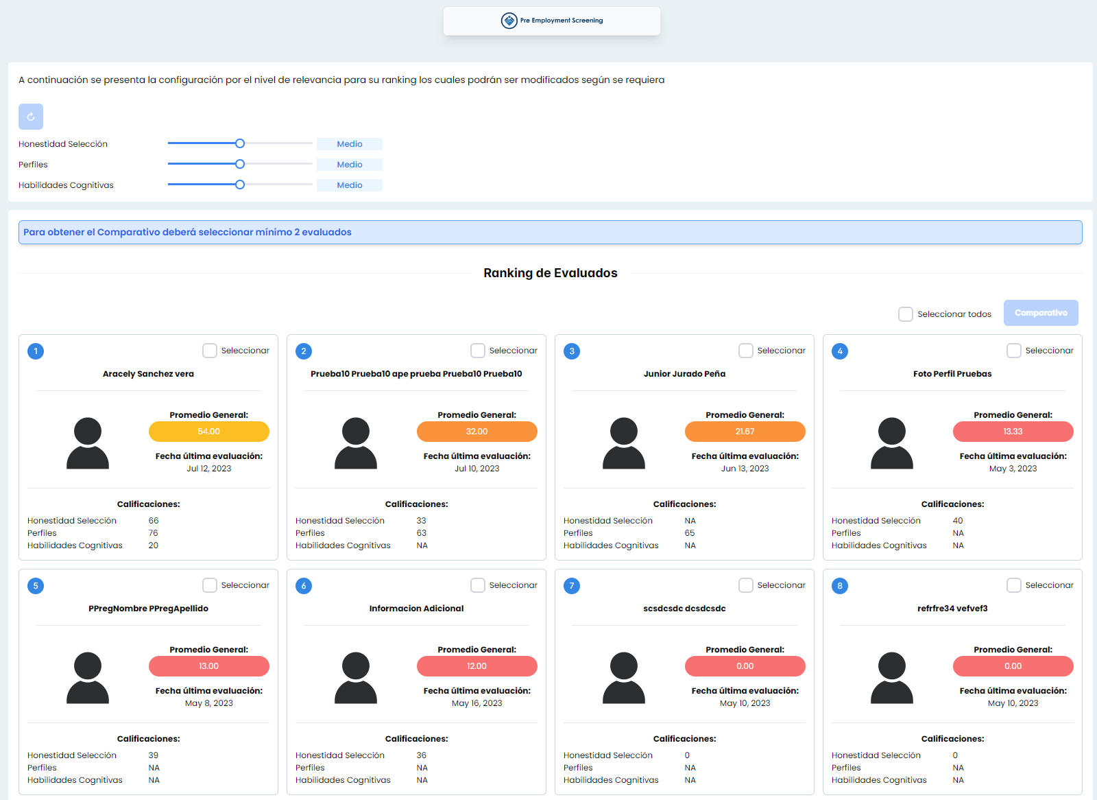 Se adjuntan capturas del Ranking (Tarjetas del Ranking de los evaluados)