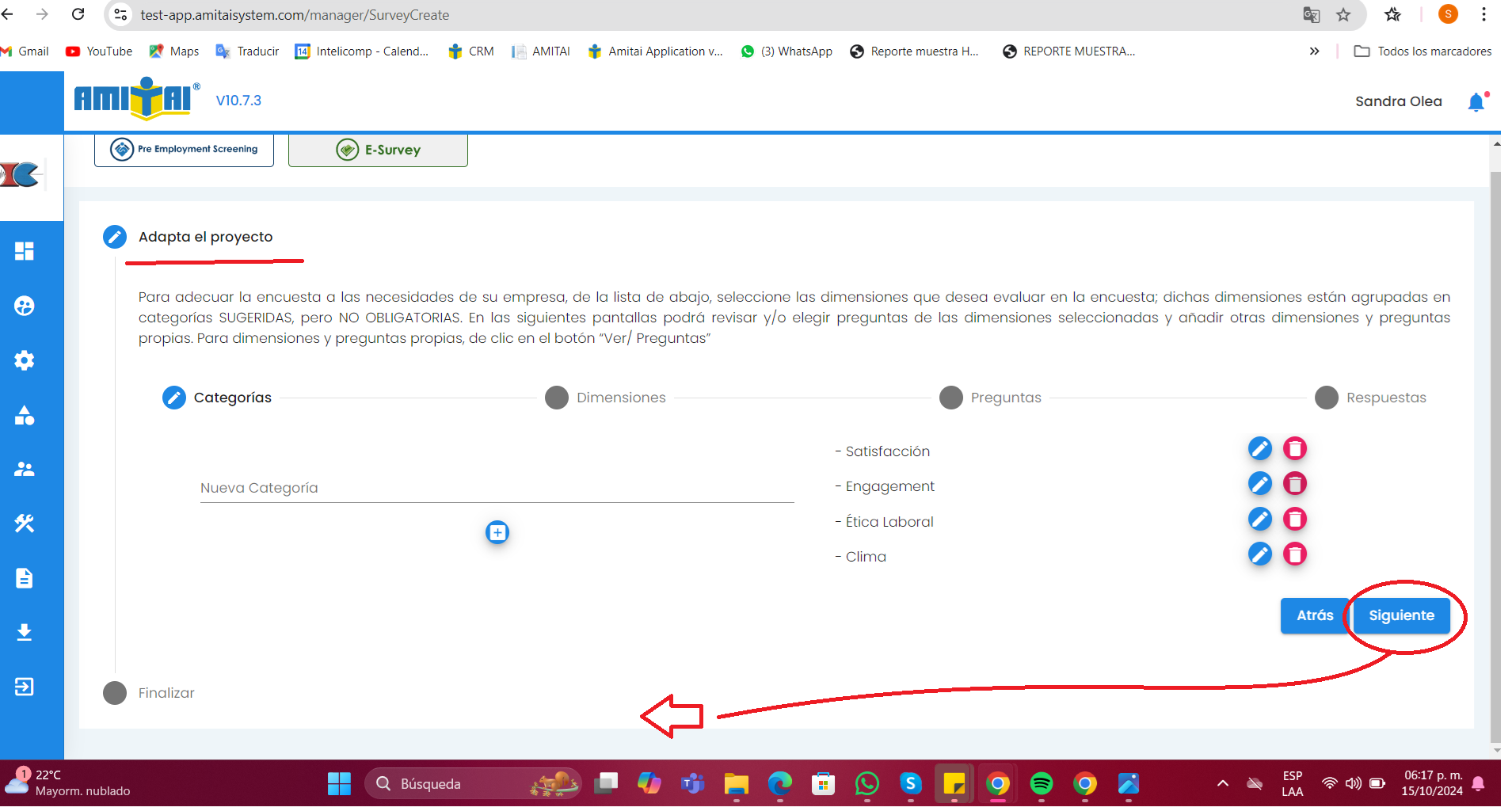 Cuando se esta configurando la encuesta de clima, los botones de siguiente te llevan directamente a la ultima seccion de finalizar y no a la siguiente seccion como de categorias a dimensiones a preguntas, etc