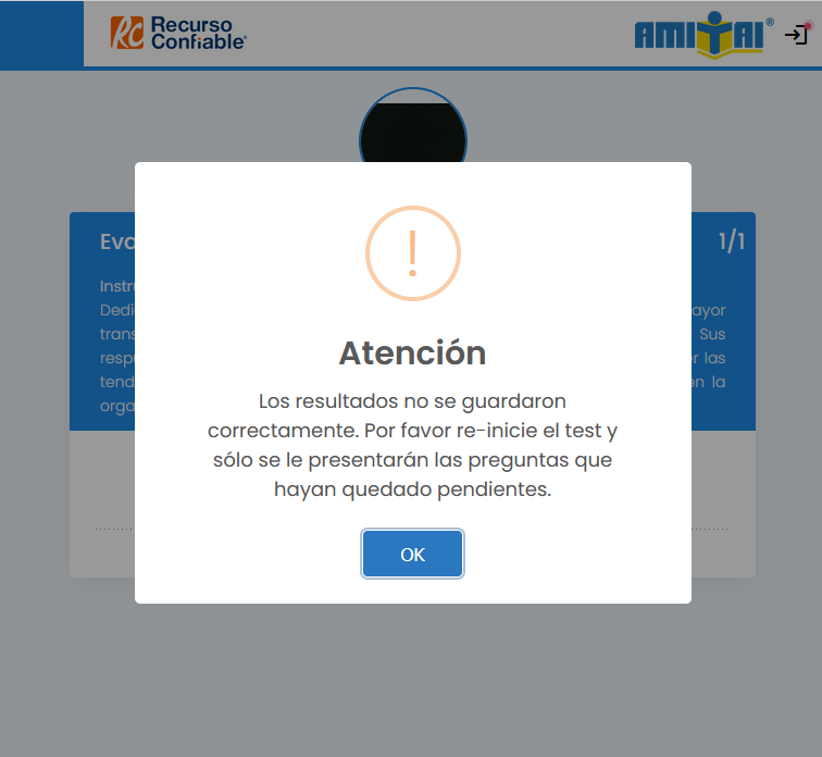 Al finalizar la evaluacion manda mensaje :"Los resusltados no se guardaron ocrrectamente. Pro favor reinicie el test y solo se presentaran las preguntas pendientes" . Al iniciar el test manda mensaje que ya fue concluida la evaluacion.