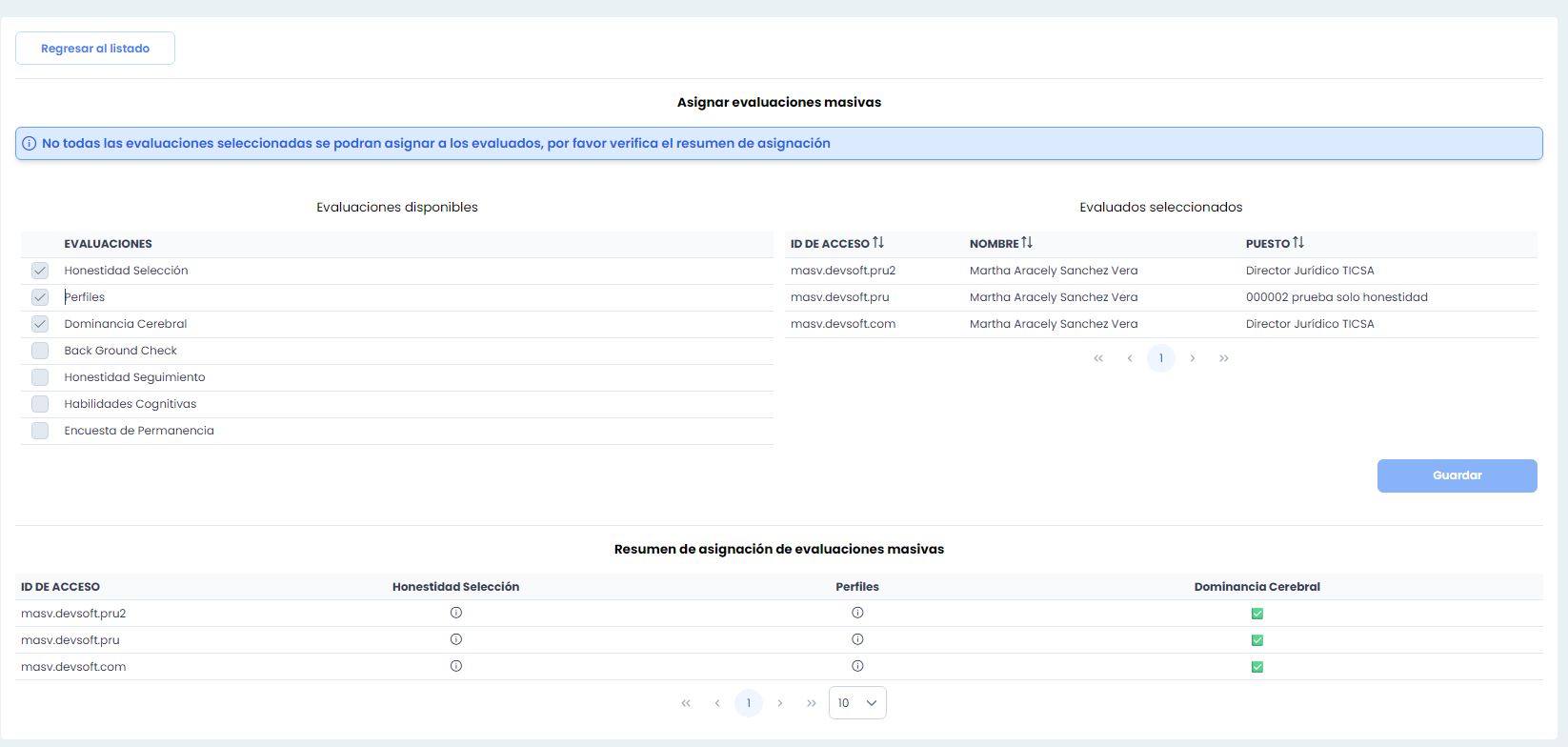 Para la asignación de evaluaciones de forma masiva, dependiendo la evaluación que se seleccione se debe indicar que ID´s no se cargaron y cual fue la razón. Anexo los mensajes: