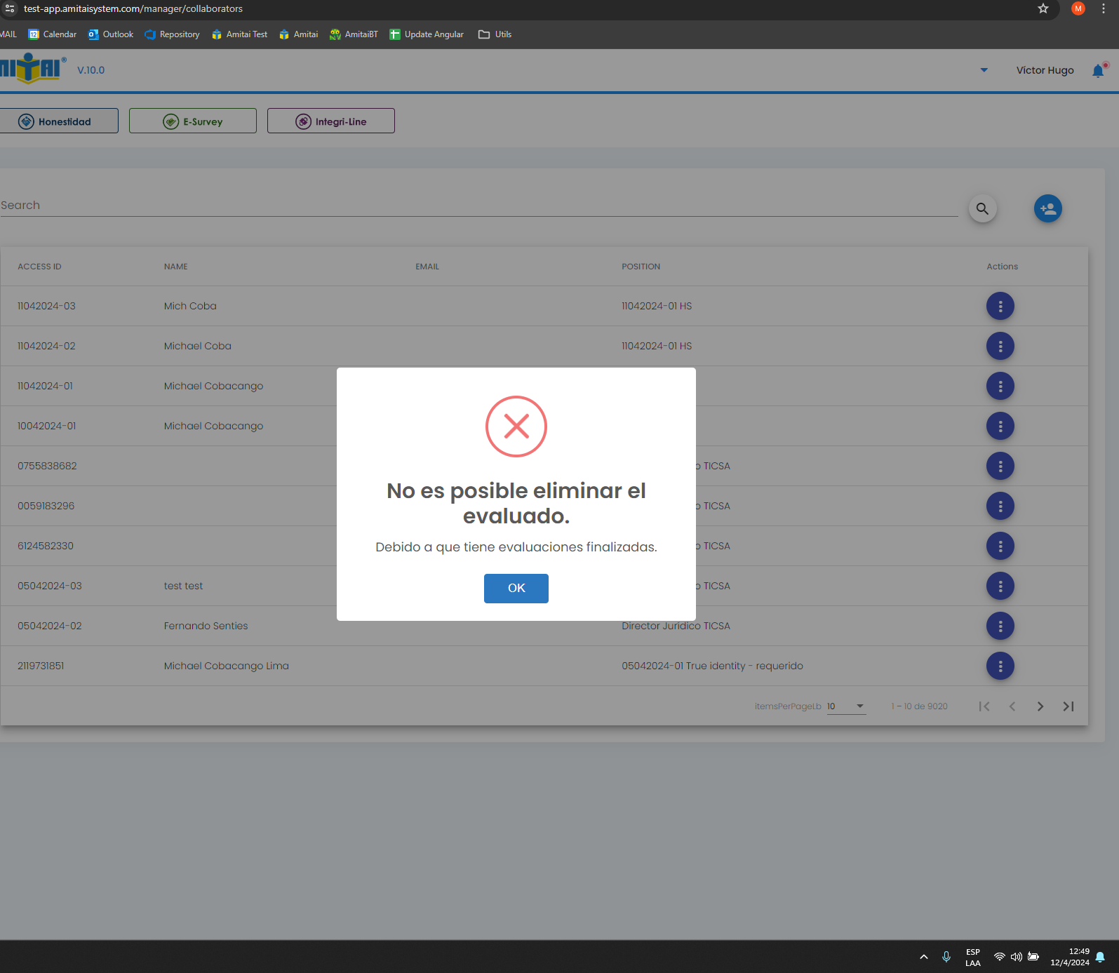 Se valida en el ambiente de pruebas que no se puedan eliminar los evaluados una vez que tengan evaluaciones finalizadas