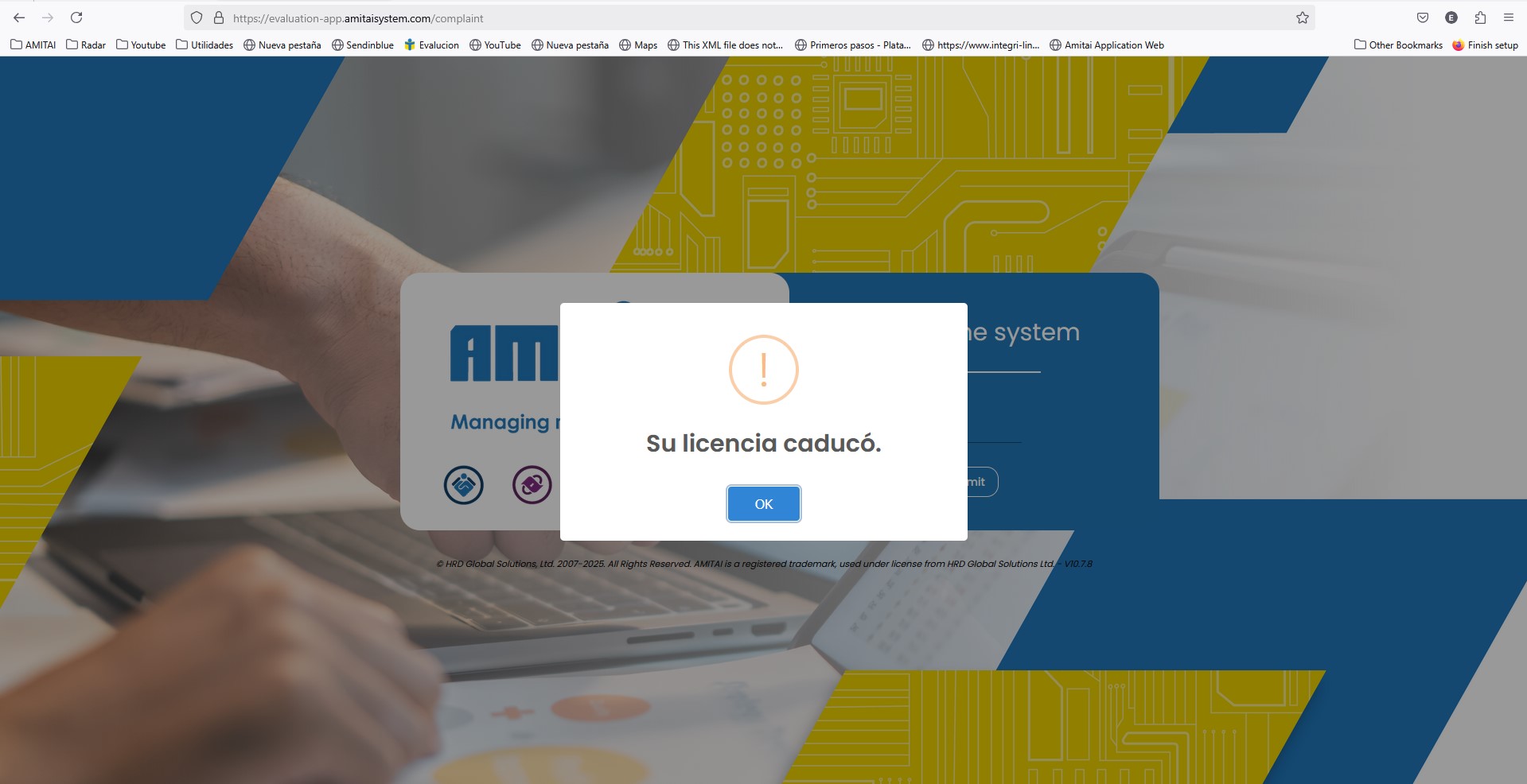 Seccion de Integriline, donde el navegador tiene la configuracion en Ingles el mensaje de Licencia Caduca se muestra en español