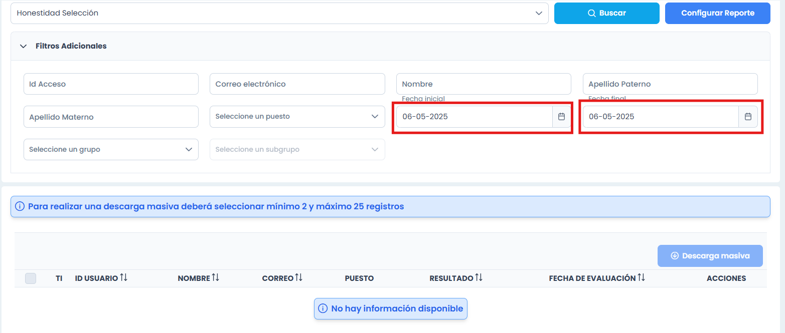 Al buscar reportes mediante el filtro de fecha, no me permite realizarlo si hago la búsqueda del día que se realizó la evaluación, se tiene que buscar un día antes y un día después para que te lo pueda arrojar
